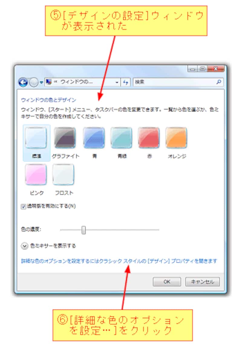 [ウィンドウの色とデザイン]をクリックすると、[デザインの設定]ウィンドウが表示されますので、[詳細な色のオプションを設定…]をクリックします。