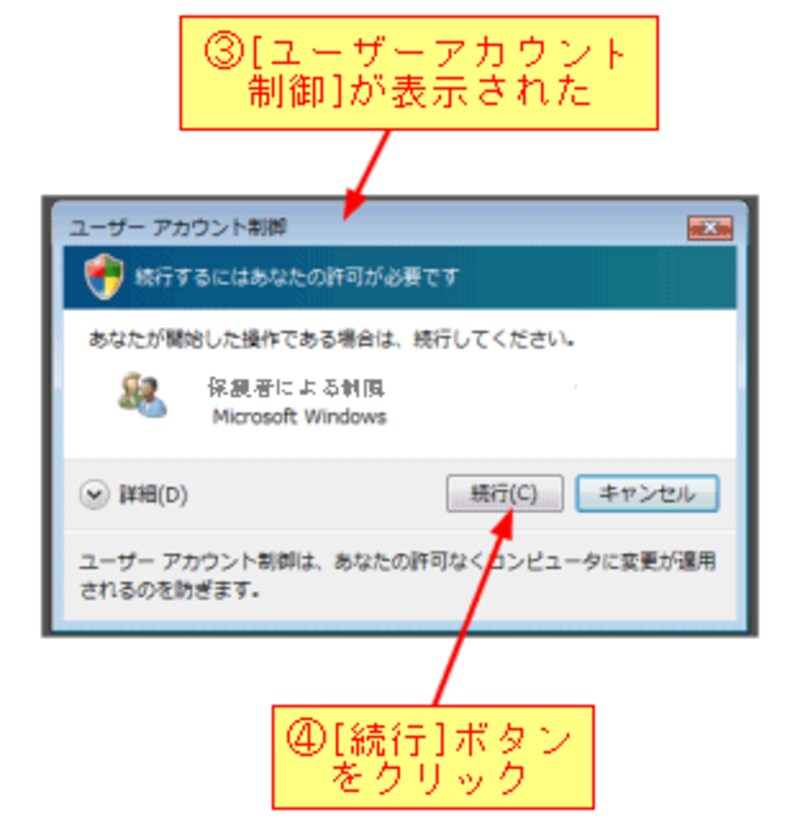 [任意のユーザーへの保護者による制限のセットアップ]をクリックすると、[ユーザーアカウント制御]ダイアログボックスが表示されますので、[続行]ボタンをクリックします。