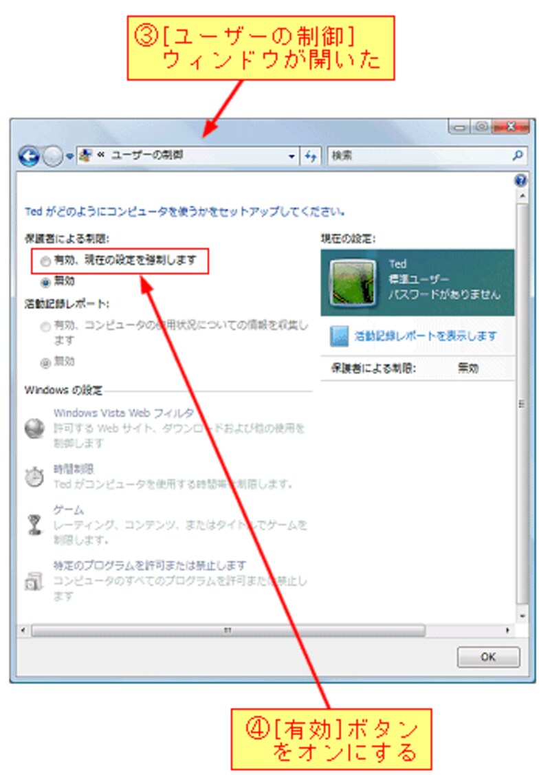 保護するユーザーをクリックすると、[ユーザーの制御]ウィンドウが開きますので、[有効]ボタンをオンにします。