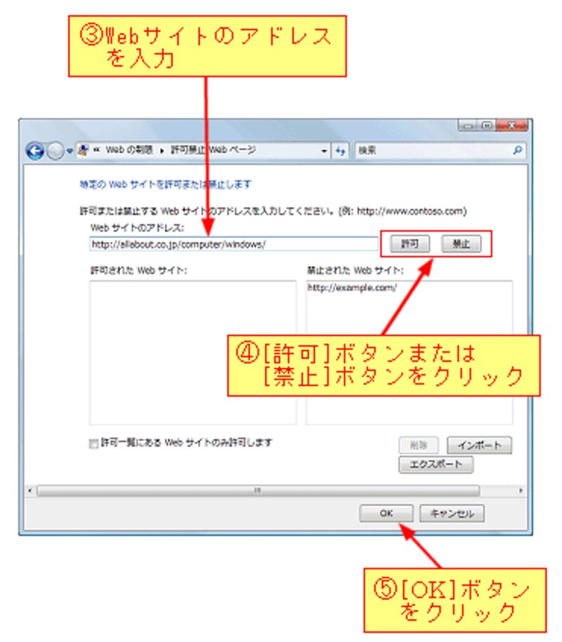 アクセスを許可または禁止するWebサイトのアドレスを入力し、[許可]ボタンまたは[禁止]ボタンをクリックします。