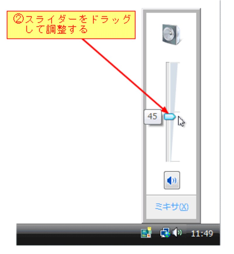 [スピーカー]アイコンをクリックすると[ボリューム調整]画面が表示されますので、スライダーを上下にドラッグして音量を調整します。