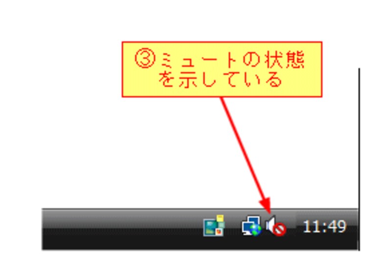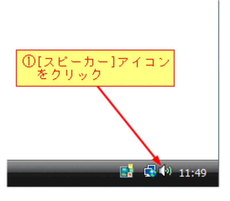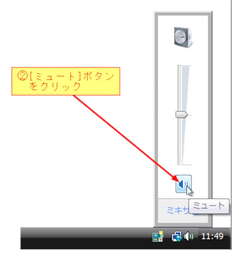 [スピーカー]アイコンをクリックすると[ボリューム調整]画面が表示されますので、[ミュート]ボタンをクリックします。