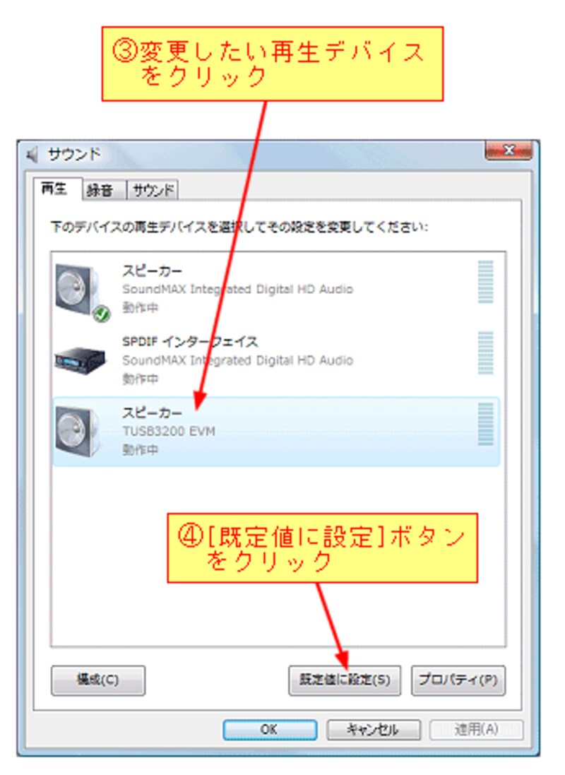 [再生デバイス]をクリックすると、[サウンド]ダイアログボックスが表示されますので、変更したい再生デバイスをクリックしてから[既定値に設定]ボタンをクリックします。