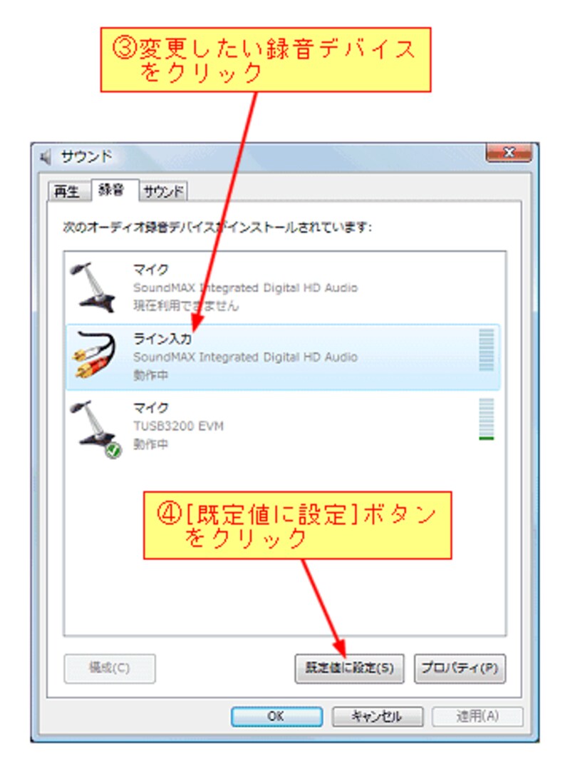 [録音デバイス]をクリックすると、[サウンド]ダイアログボックスが表示されますので、変更したい録音デバイスをクリックしてから[既定値に設定]ボタンをクリックします。