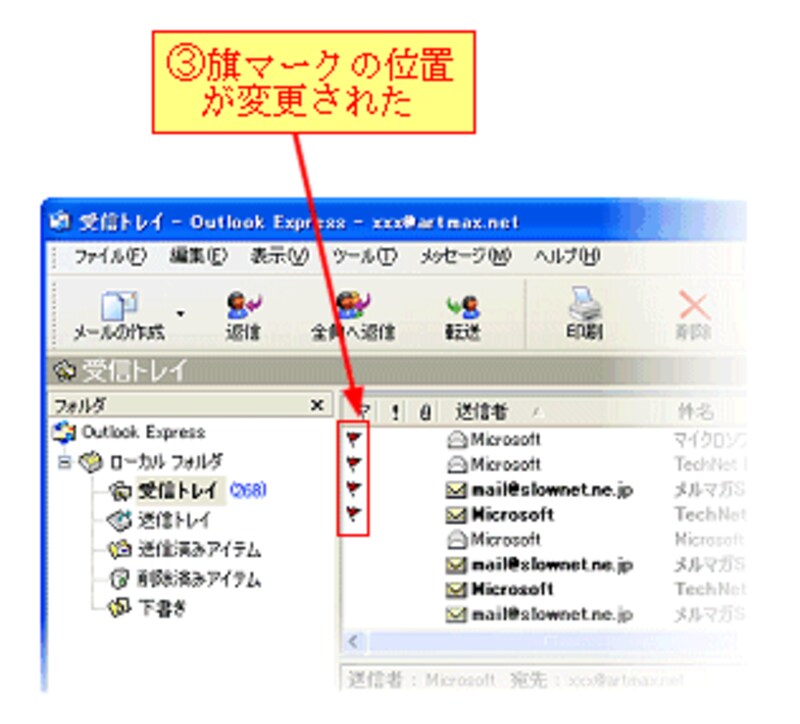 ツールバーの旗マークの位置を変更したい場合は、[表示項目の設定]ダイアログボックス内の[フラグ]を選択し、[上へ]ボタンあるいは[下へ]ボタンで順番を変更します。