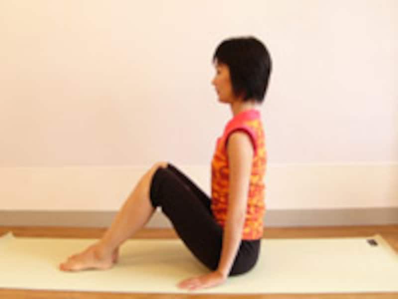 (1)両ひざを揃え、骨盤はマットに対して垂直にし、背筋を伸ばして座る。<息を吸って>準備。