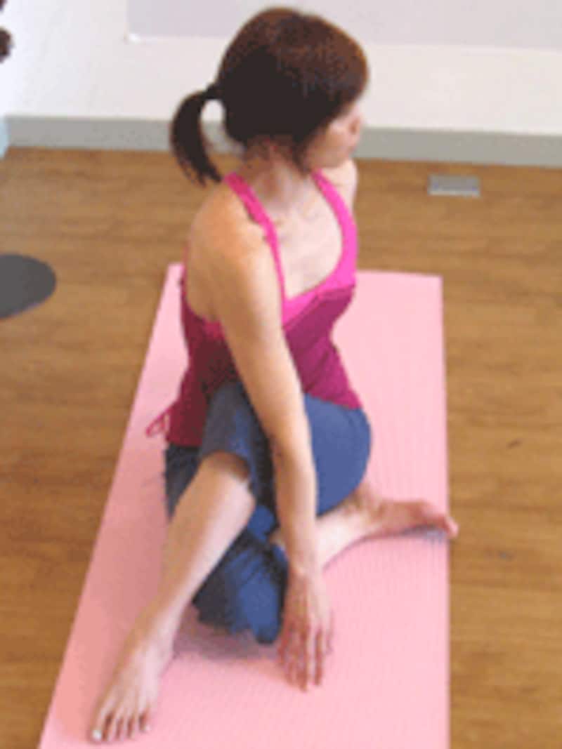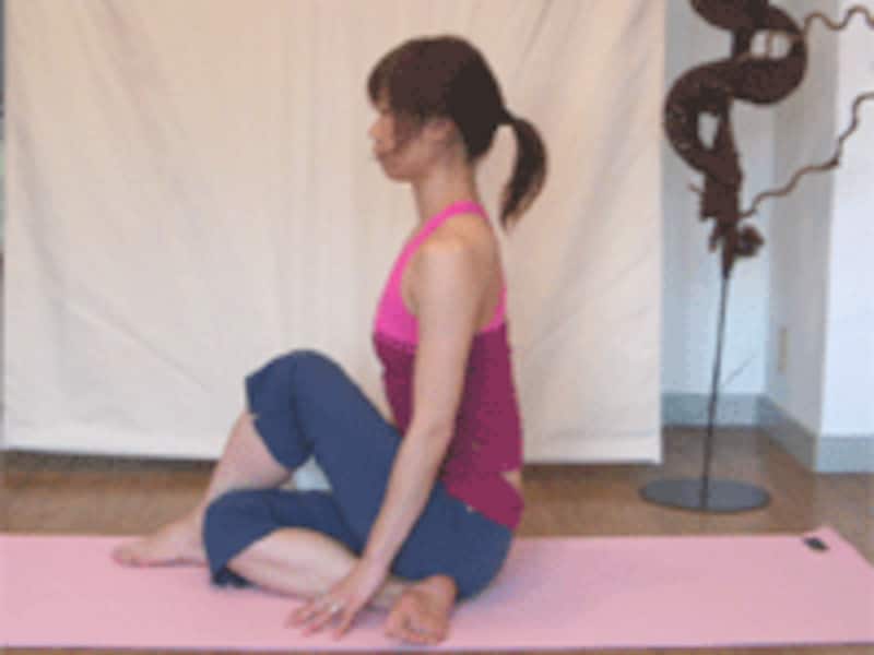 ねじりのポーズは、腹部を刺激し腸の働きが活発になるので、腰まわりの冷え改善に効果大!ウエストラインもスッキリしますので、腹部のたるみが気になる人には一石二鳥のポーズです。腰や背中が丸くならないよう注意して行いましょう。【ねじりのポーズ】