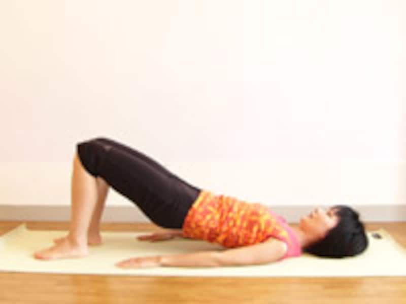 ※骨盤を持ち上げるのがつらい人は、両手を腰にあて、サポートしましょう。