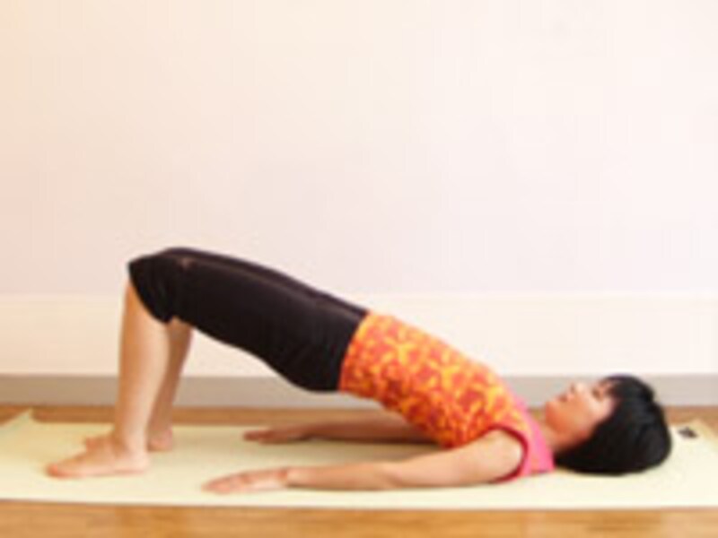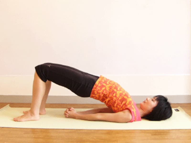 背中を引き締めるのにピッタリな橋のポーズ。背中を鍛えると同時に、腹筋も使うので、一石二鳥。おへそ周辺が温まってくるのを楽しもう。【橋のポーズ】