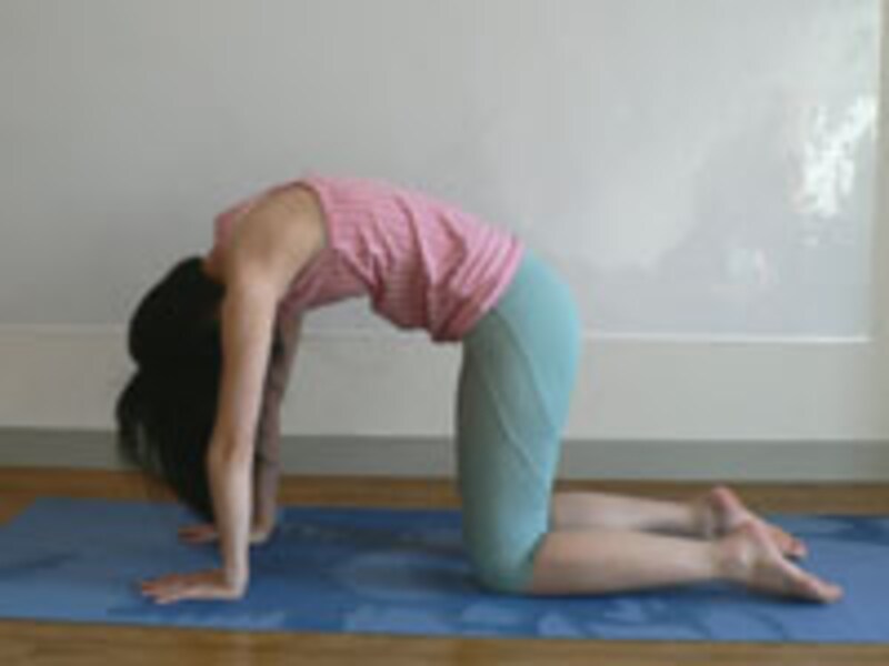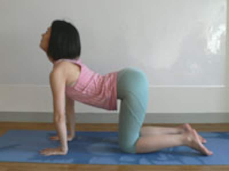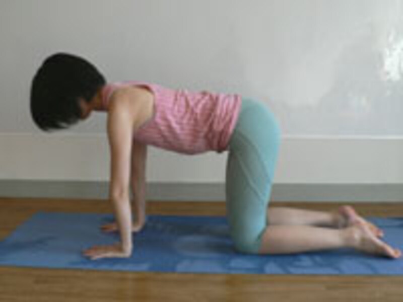 ”ほぇ~、気持ちいい~、と言えば、ネコのポーズ。まずは疲れて凝り固まった背中をほぐして、心と体をリラックス。大きくゆっくり呼吸しながら行います。【ネコのポーズ】