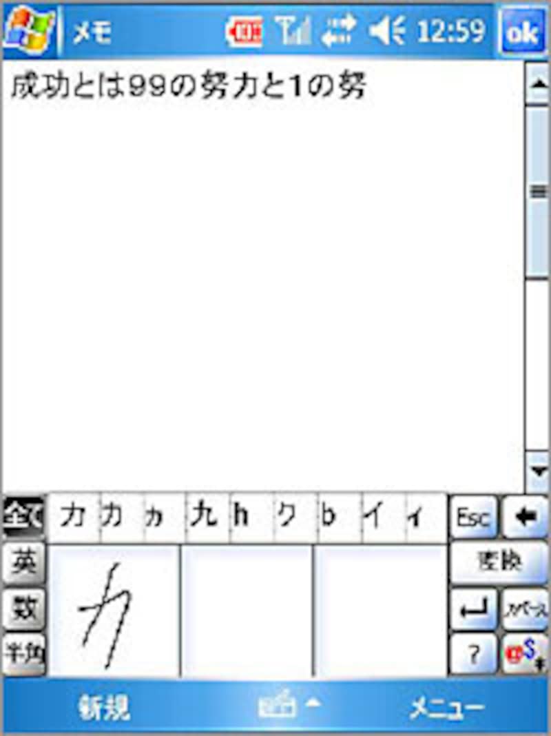 手書き入力は、中央の3つの入力パネルに直接スタイラスを使って文字を書き込んで入力します。入力した文字は、順次認識されて、上段に読み取った文字の変換候補が表示されますので、正しい文字を選んで確定します。左の[英][数][半角]キーを選択して絞り込むことで、変換効率をアップさせることができます。