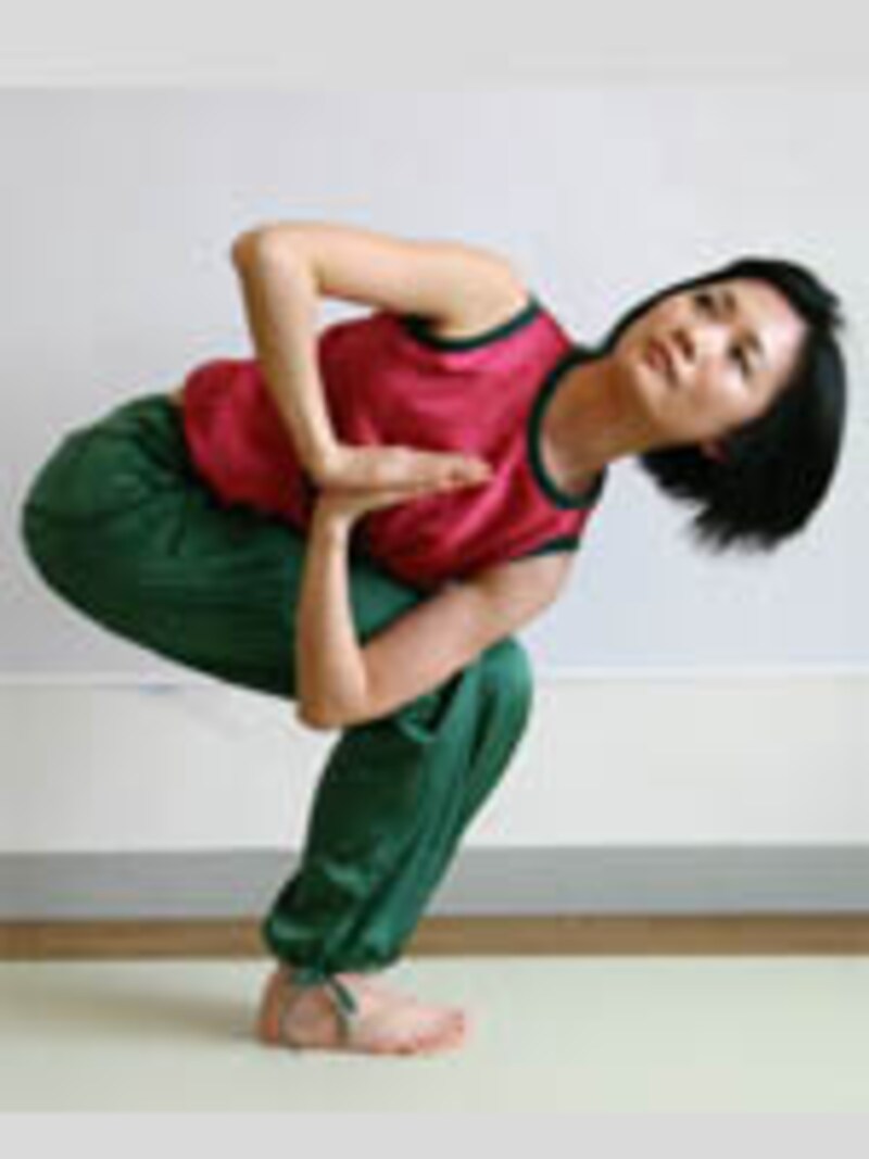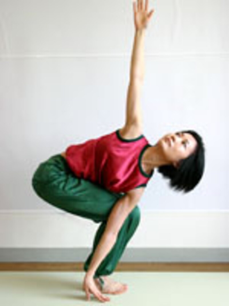 左ヒジを右ヒザにかけ、さらにしっかりと上半身をねじり、バランスをとる。