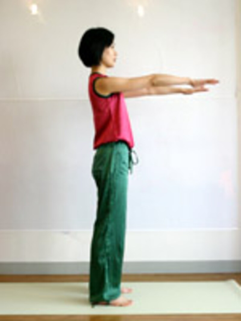 ※両手を伸ばすとバランスが取りにくい場合は、(3)の姿勢のまま5呼吸する。