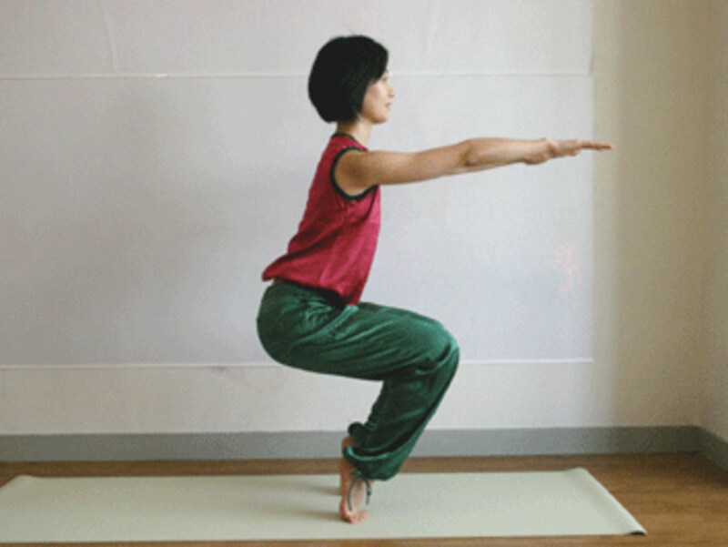 つま先立ちで姿勢をキープするチェアーのポーズは、腹筋への意識が欠かせません。最初はバランスを取るのが難しいと思いますが、毎日チャレンジして完成形を目指しましょう。ふくらはぎと足首に本当によく効くので、14日間続ければ、きっと変化を感じられるはずです!