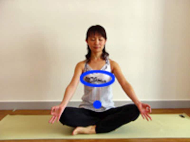 2.息が鼻と喉を通り、体の中心を上下するようなイメージを保ちながら、ゆっくりとした腹式呼吸を行います。