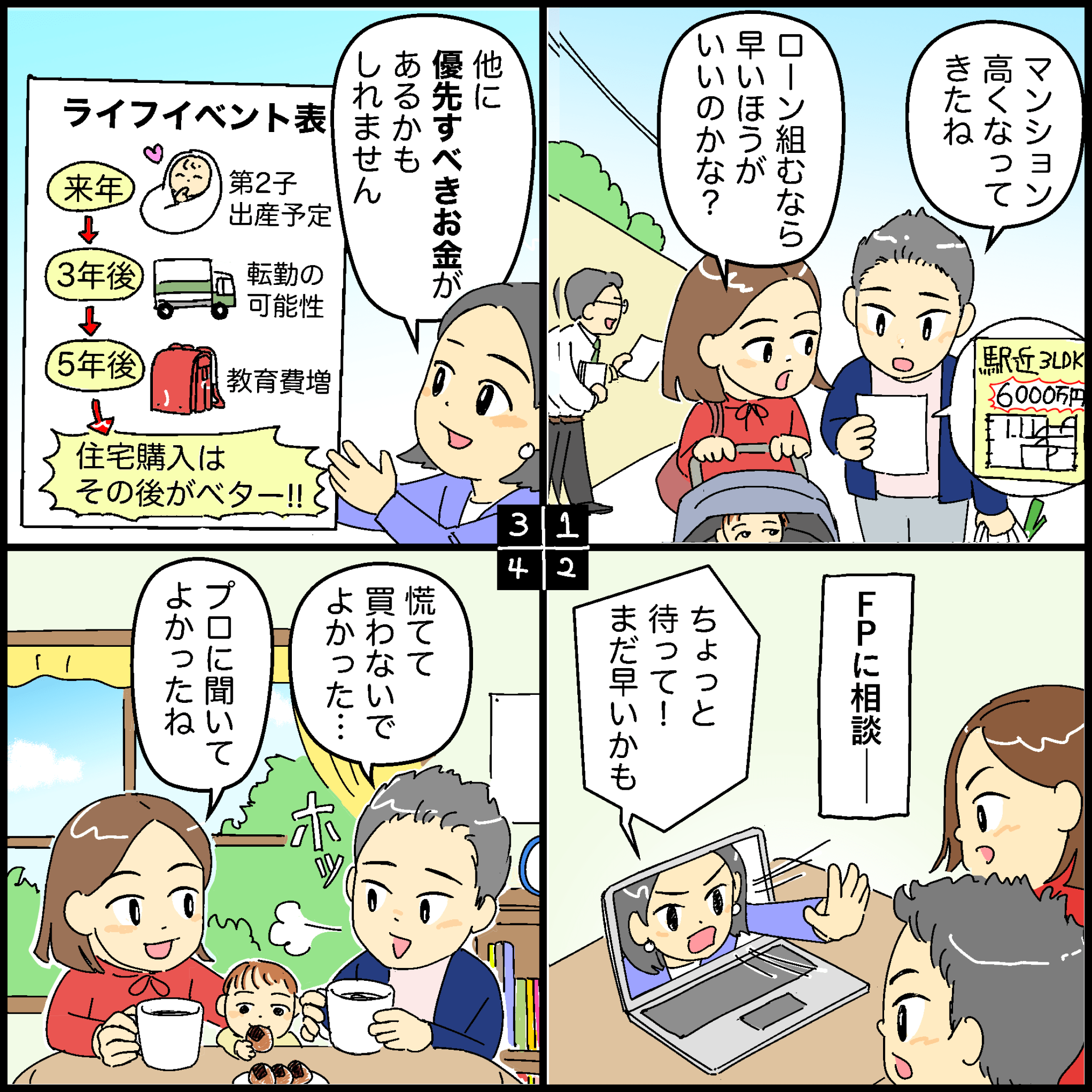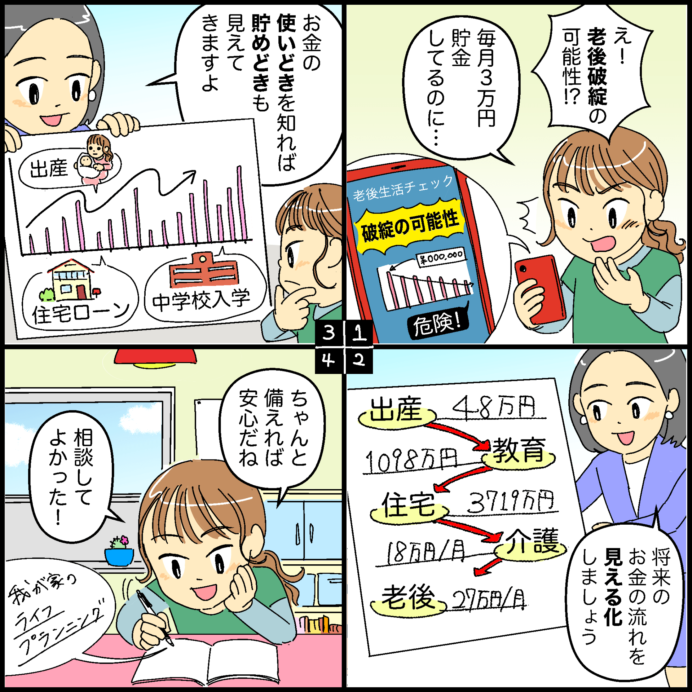 周りから「今の時代、奥さんも無理してでも働いた方がいい」と言われ、日々不安だったのですが、今回の相談で専業主婦として子育てをしながらでもやっていけそうだと分かり、安心しました。綿密に計算されたマネープランを見せていただき、何をどのくらい対策したらいいのかが具体的にわかって、ぼんやりとした将来への不安が払しょくされました。
